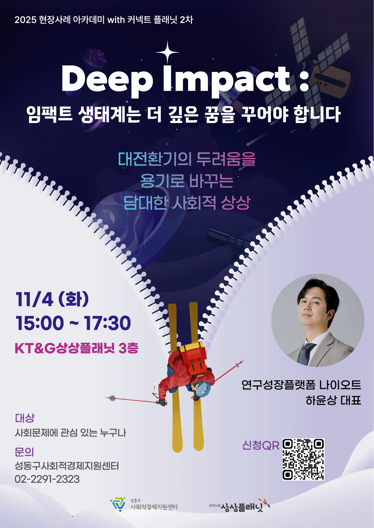 KT&G 상상플래닛과 성동구 사회적경제지원센터가 공동주관으로 현장사례 아카데미를 열어요! 임팩트 생태계가 함께 만들 가능성을 상상하며, 소중한 관계를 쌓아요.