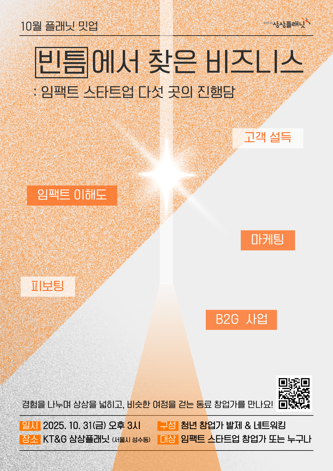 ✔️일시: 10월 31일(금) 오후 3~6시 ✔️장소: KT&G 상상플래닛 8층 (성수역 도보 7분) - 서울특별시 성동구 뚝섬로13길 38 (성수동) ✔️대상: KT&G 상상플래닛 입주사, 또는 주제에 관심 있는 누구나
